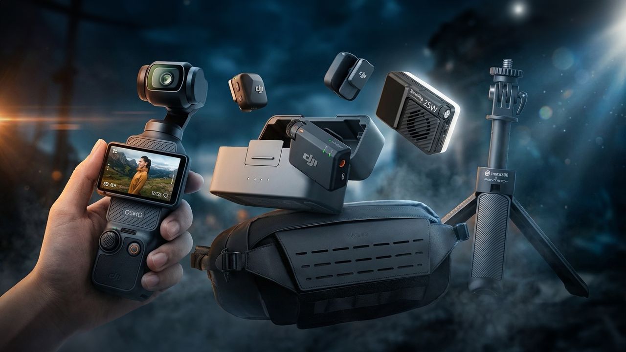 Doğal olarak iyi bir video kamera istiyorsunuz ve ben de DJI Cep 3 vlog kamerası ve bir kameralı telefon burada ikisini de kullanıyorum. Kaliteli prodüksiyonlar için net ses çok önemlidir ve kablosuz mikrofon size bunu verecektir – DJI’ın kendi çiftleri Pocket 3 ile sorunsuz bir şekilde eşleşir, Godox Cube C ise telefonlarla mükemmeldir. Mümkün oldukça konularıma biraz ışık ve taşınabilir bir ışık eklemeyi seviyorum. mini LED video ışığı hile yapar.